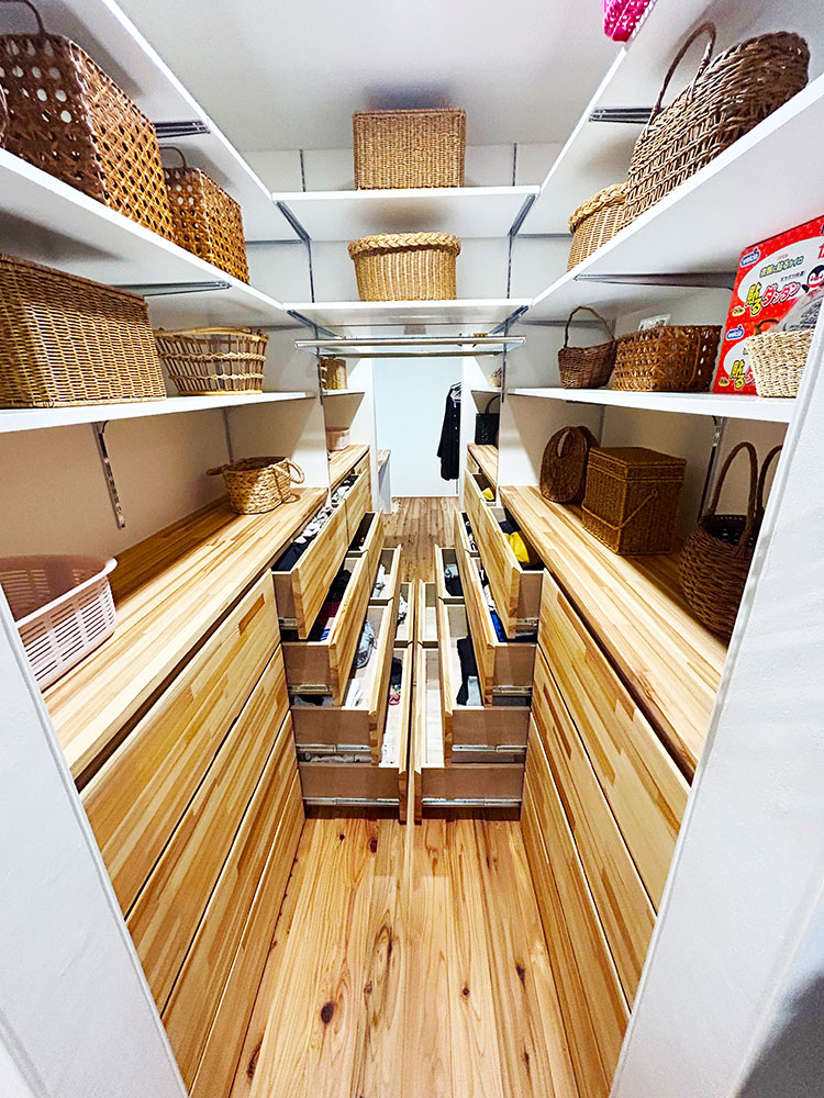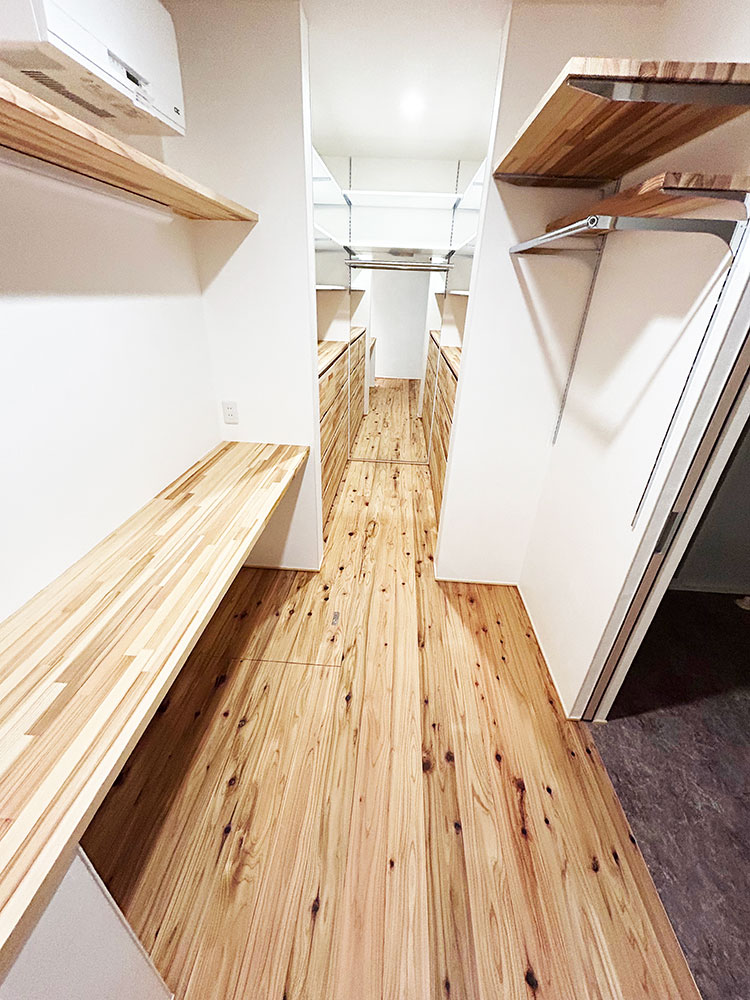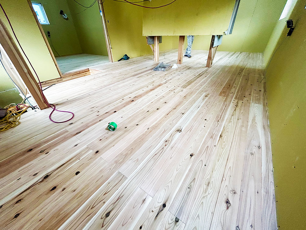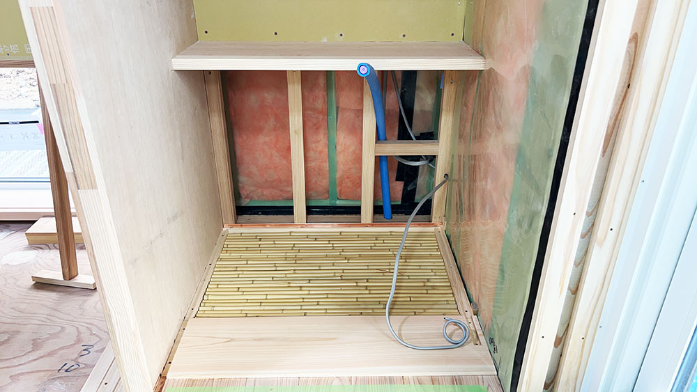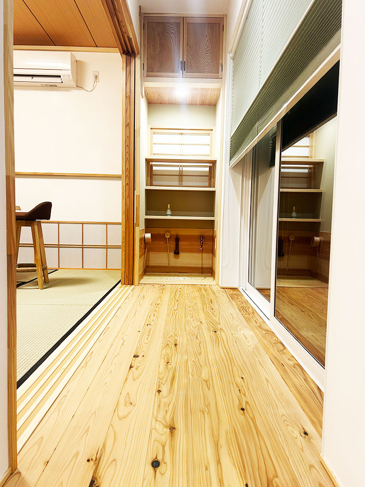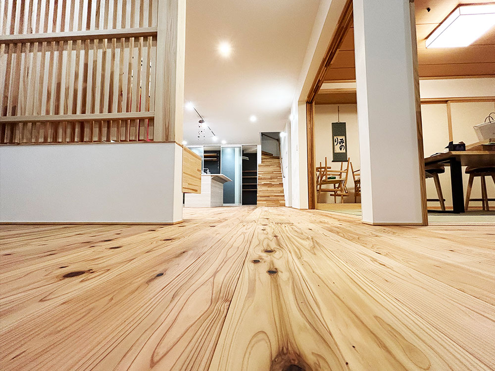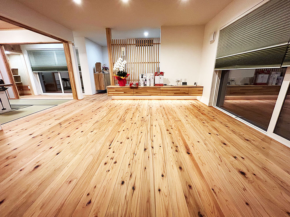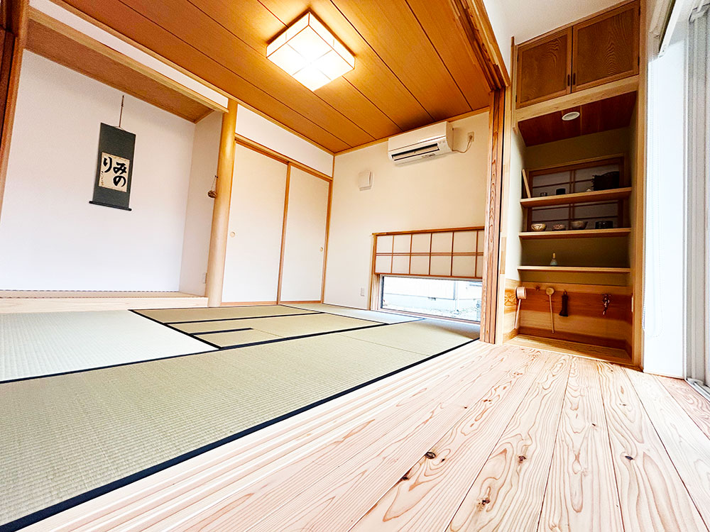また調湿効果を期待して壁にはしっくいを塗り、畳は天然い草を採用しており自然と調和した杉材の家となっております。
